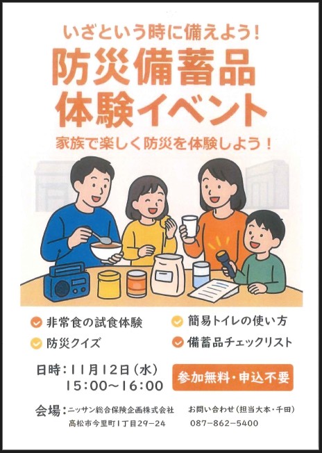この度、R7/11/12日(水)15:00~16:00の間で「防災備蓄品体験イベント」を開催します。